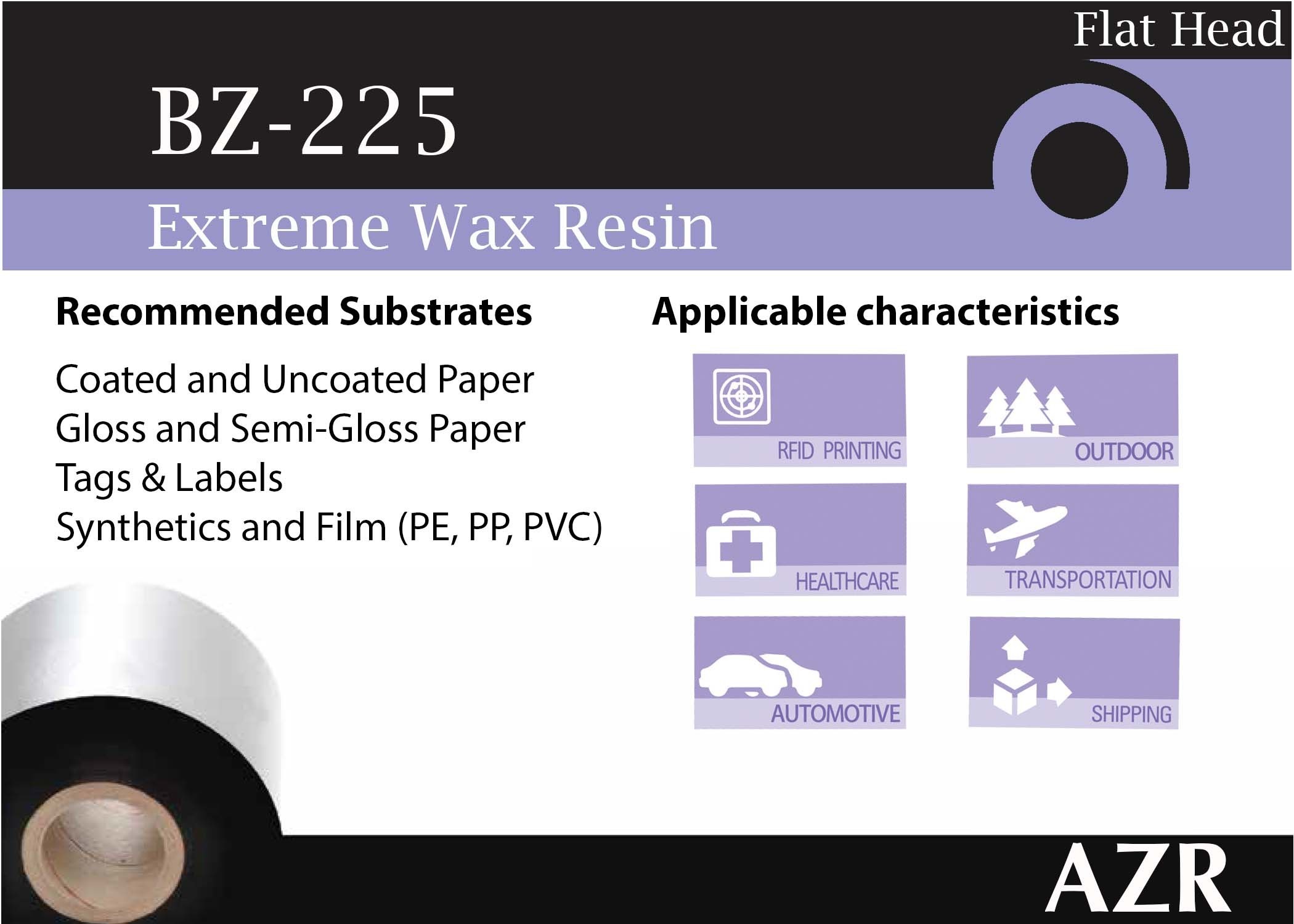 BZ-225 หน้ากว้าง 110 มิลลิเมตร ความยาวมีให้เลือกถึง 4 แบบ มี 74, 100, 200, 300 เมตร การม้วนแบบ F/OUT ขนาดของแกน 1 นิ้ว หมึกสีดำ เหมาะสำหรับสติ๊กเกอร์ ประเภท Coated และ Uncoated Paper, High Gloss Paper, Synthetics Paper งานพิมพ์ เช่น ร้านค้าปลีก Tags สินค้า Healthcare อุตสาหกรรมยานยนต์ การขนส่ง คลังสินค้าและโลจิสติกส์