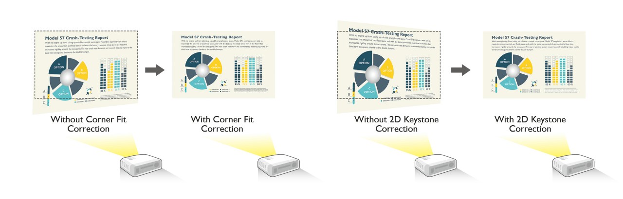 MX731 is equipped a two-dimensional keystone correction range of ±30° on horizontal and ±20° on vertical axes to counteract the trapezoid effect when the projector must be installed off-center. Installers can use Corner Fit control to adjust each corner independently for perfectly aligned image geometry.