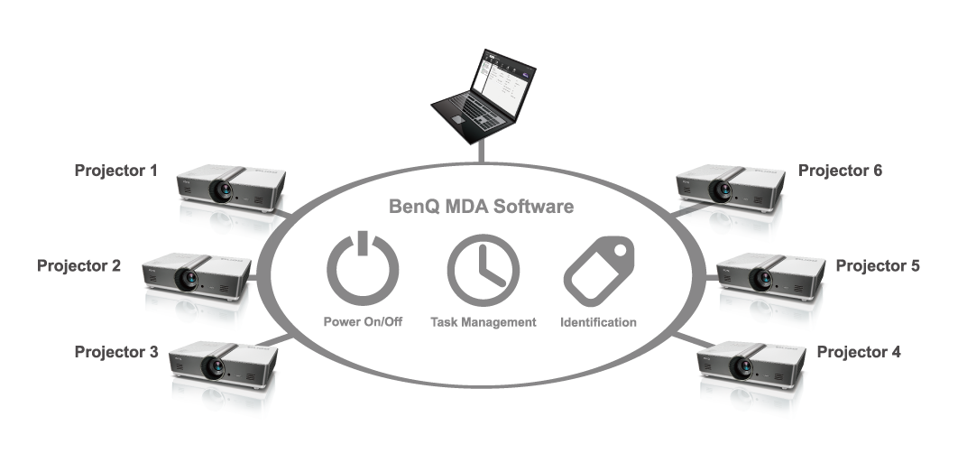 BenQ Multiple Display Administrator (MDA) software provides powerful centralized multiple-projector management including automated opening and closing procedures for public spaces, remotely controlled power on and off, and scheduling for institutions and corporations.