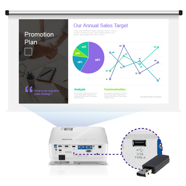 Supporting a wide range of files including JPEG, PDF, Microsoft Word, Excel and PowerPoint files, MX731’s USB Type-A port lets presenters easily project images or documents directly without the need for a laptop.