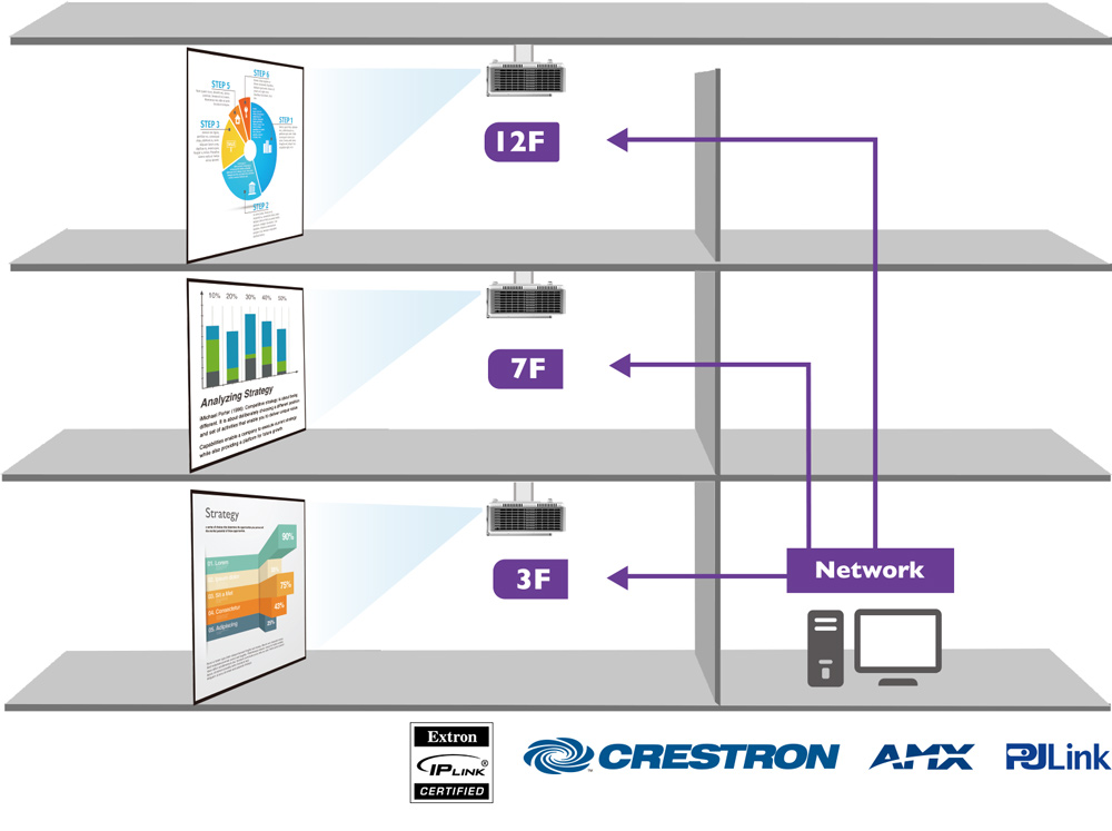 MX731 is widely compatible with leading projector control systems including Crestron, AMX, PJ Link and Extron IP Link for network control via LAN, making it simple to integrate into corporate network infrastructures. MX731 also supports RS-232 for reliable long-distance Installation up to 15 meters, when there is no LAN infrastructure.