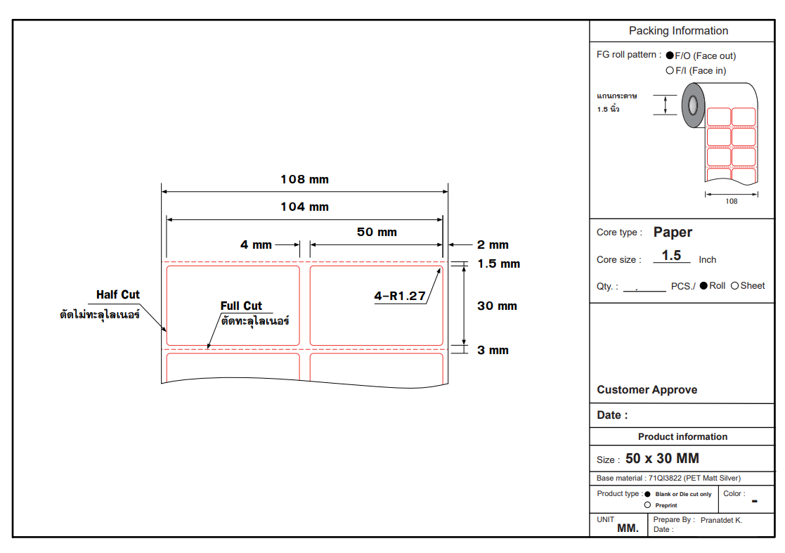 สติ๊กเกอร์ดวงเปล่า แบบกึ่งมันกึ่งด้าน Thermal Transfer (TT) ขนาด 70 x 110 มิลลิเมตร แกน 1.5 นิ้ว ใช้กับหมึกริบบอน เหมาะสำหรับ ฉลากบาร์โค้ด ฉลากข้อมูลสินค้า ฉลากวันหมดอายุและล็อตการผลิต ฉลากที่อยู่ ฉลากราคา ฉลากสินค้าต่างๆ เป็นต้น ถ้าลูกค้าต้องการขนาดอื่น สามารถสั่งผลิตตามขนาดที่ลูกค้าต้องการได้