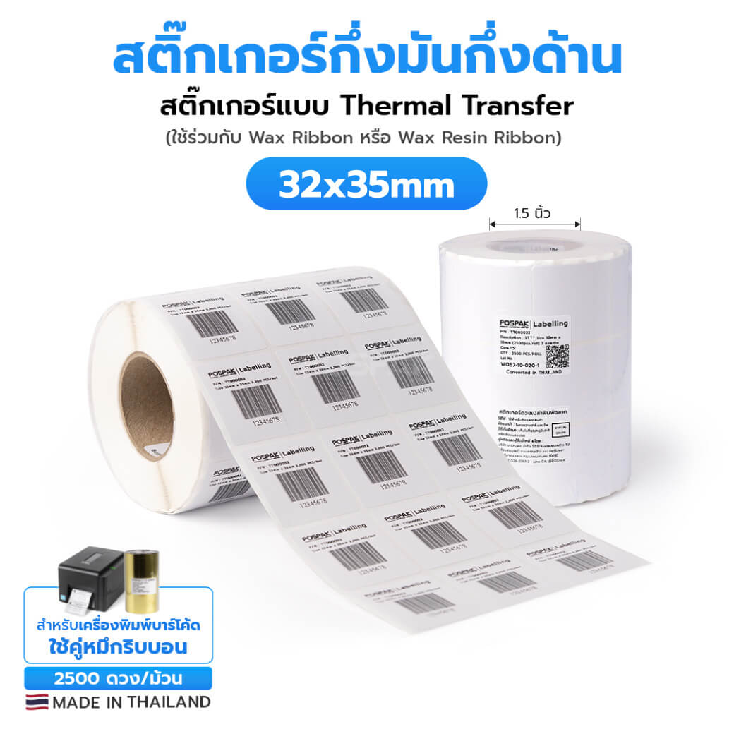 ST.TT Size 32 x 35 mm (3.2 x 3.5 cm) Sticker 2,500 ดวง/ม้วน แกน 1.5 นิ้ว สติ๊กเกอร์กระดาษ กึ่งมันกึ่งด้าน (ใช้ร่วมกับ Wax Ribbon หรือ Wax Resin Ribbon)(PN:TT000032)