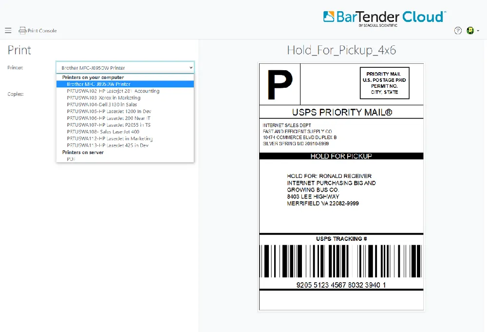 • Intelligent Printing (การพิมพ์อัจฉริยะ): BarTender Cloud สามารถค้นหาเครื่องพิมพ์ในเครือข่ายท้องถิ่นได้โดยอัตโนมัติ และใช้ไดรเวอร์ของ Seagull Drivers กว่า 8,000 ตัวสำหรับการพิมพ์ที่มีประสิทธิภาพสูงสุด ทำให้ไม่ต้องยุ่งยากกับการติดตั้งและจัดการไดรเวอร์เครื่องพิมพ์