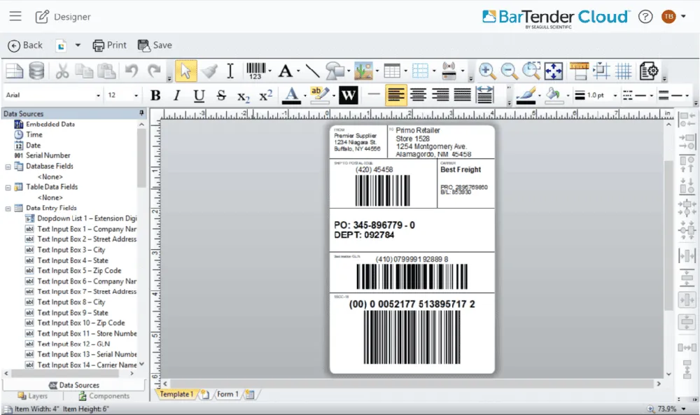 BarTender Cloud Designer เปิดตัวอย่างเป็นทางการแล้ว ทำให้ Seagull Scientific เป็นโซลูชันการติดฉลาก, การทำเครื่องหมาย และการเข้ารหัสเจ้าแรกที่นำเสนอ เครื่องมือออกแบบฉลากบนคลาวด์ ด้วยอินเทอร์เฟซการออกแบบที่ใช้งานง่ายและเครื่องมือแบบ Wizard ผู้ใช้สามารถสร้างและพิมพ์ฉลากได้อย่างรวดเร็วโดยไม่ต้องมีประสบการณ์ด้านการออกแบบมาก่อน นอกจากนี้ ยังช่วยให้นักออกแบบฉลาก BarTender นับพันคนทั่วโลกสามารถใช้ทักษะการออกแบบฉลากที่มีอยู่แล้วกับแผนบัญชี BarTender Cloud ได้โดยไม่มีค่าใช้จ่ายเพิ่มเติม