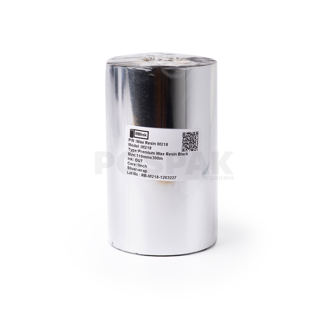 RBink M218 หน้ากว้าง 110 มิลลิเมตร ความยาว 300 เมตร การม้วนแบบ F/OUT ขนาดของแกน 1 นิ้ว หมึกสีดำ สามารถใช้กับเครื่องพิมพ์สติ๊กเกอร์บาร์โค้ดได้ทุกยี่ห้อ ที่มีระบบในการพิมพ์เป็น Thermal Transfer ใช้กับลาเบลหรือสติ๊กเกอร์ เนื้อกึ่งมันกึ่งด้าน แบบ Thermal Transfer (TT), PP, UPO, PET, PVC เช่น งานพิมพ์ ติดฉลากทั่วไป อาหารและเครื่องดื่ม ขายปลีก Healthcare เภสัชกรรม อุตสาหกรรมสารเคมี การขนส่ง คลังสินค้าและโลจิสติกส์ ระบุทรัพย์สิน เป็นต้น
