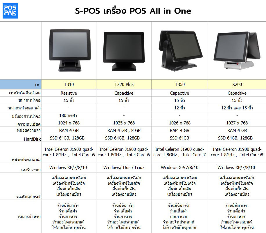 ขึ้นชื่อว่าเครื่อง POS ลักษณะการทำงานเหมือนกัน แต่ต่างกันที่รูปทรง เทคโนโลยีหน้าจอ ลักษณะการนำไปใช้งาน ซึ่งมีทั้ง 1 จอแสดงผล และ 2 จอแสดงผล ทั้งหมดมี 4 รุ่นหลักๆคือ T310 , T320 plus , T350 และ X200 ซึ่งเราได้จัดทำตารางเปลี่ยนเทียบดังนี้