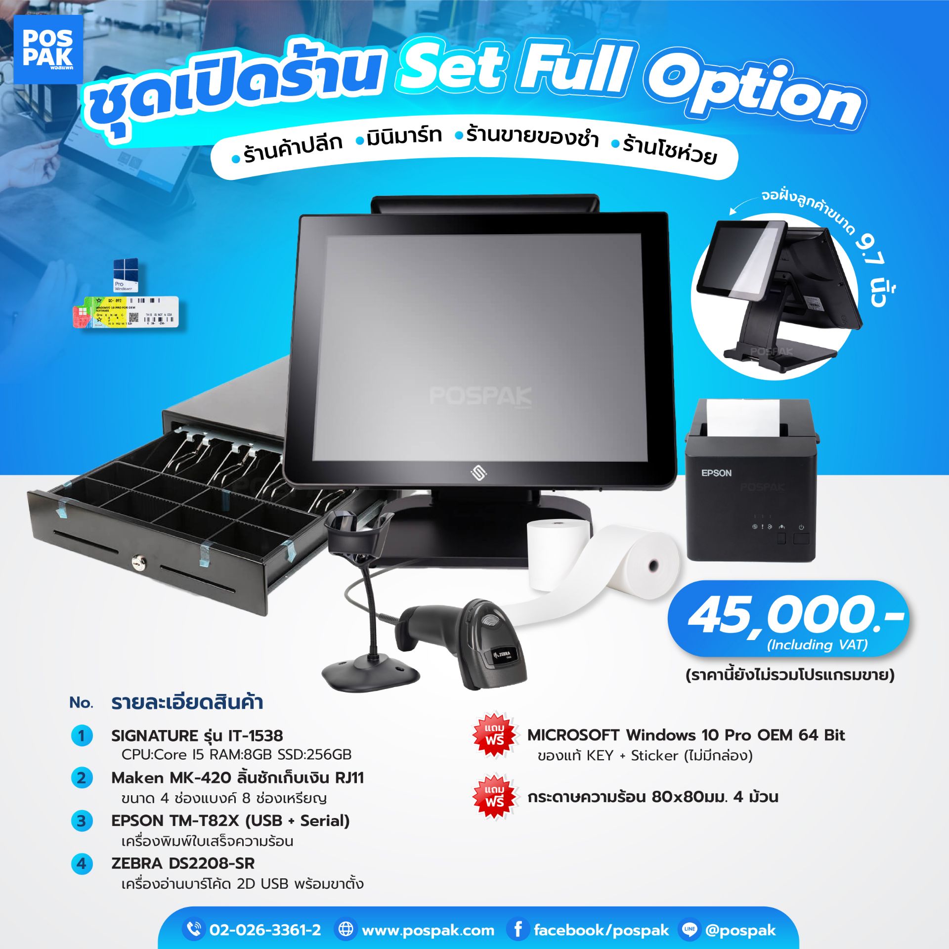 ชุดเปิดร้าน Set Full Option ร้านค้าปลีก มินิมาร์ท ร้านขายของชำ ร้านโชห่วย (ไม่รวมโปรแกรมขาย) Signature IT-1538 เครื่อง POS All In One หน้าจอสัมผัส พร้อมจอฝั่งลูกค้าขนาด 9.7 นิ้ว เป็นหน้าจอแบบ LED Touch Screen ขนาด 15 นิ้ว หน้าจอสัมผัสแบบ Capacitive ความละเอียด 1024 x 768 @60Hz. ระบบ Window 10 pro จัดเซตมาพร้อมเครื่องอ่านบาร์โค้ด 2 มิติ ลิ้นชักเก็บเงินใส่ธนบัตรได้ 4 ช่อง และ เหรียญ 8 ช่อง และเครื่องพิมพ์ใบเสร็จ มีความเร็วในการพิมพ์สูงสุดถึง 200 มิลลิเมตร/วินาที ความละเอียด 203 dpi รองรับกระดาษความร้อนหน้ากว้าง 80 มิลลิเมตร และ แถมฟรี! กระดาษใบเสร็จ 80x80 จำนวน 4 ม้วน