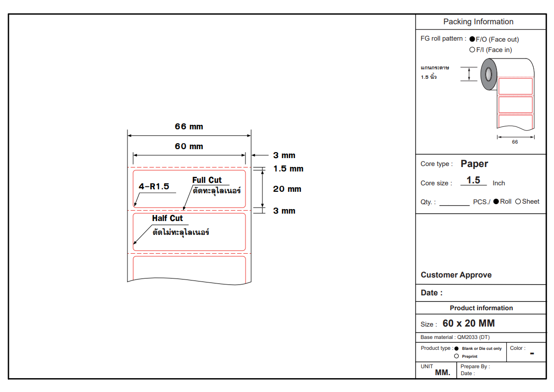 ST.DT Size 70 x 50mm (7 x 5 cm) Sticker แกน 1.5 นิ้ว (สติ๊กเกอร์ความร้อน ไม่ต้องใช้หมึกริบบอน)