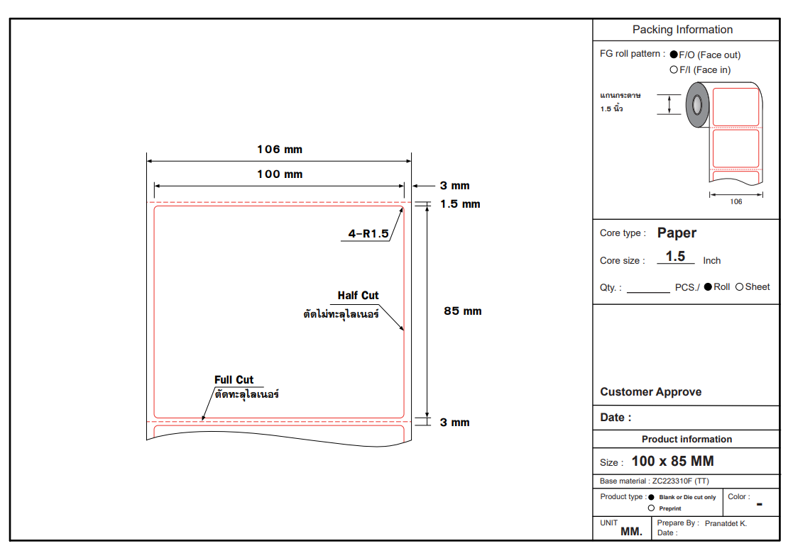สติ๊กเกอร์ดวงเปล่า แบบกึ่งมันกึ่งด้าน Thermal Transfer (TT) ขนาด 100 x 85 มิลลิเมตร (10 x 8.5 ซม.) แกน 1.5 นิ้ว ใช้กับหมึกริบบอน เหมาะสำหรับ สติ๊กเกอร์จ่าหน้าซอง ฉลากสินค้าต่างๆ งานขนส่ง เป็นต้น ถ้าลูกค้าต้องการขนาดอื่น สามารถสั่งผลิตตามขนาดที่ลูกค้าต้องการได้ เหมาะสำหรับ งานพิมพ์ทั่วไปเนื่องจากราคาประหยัด ไม่ต้องการความทนทานของตัวหนังสือ แต่ไม่เหมาะสำหรับการใช้งานพิมพ์ฉลากที่ติดสินค้าแล้วมีการเสียดสีกัน