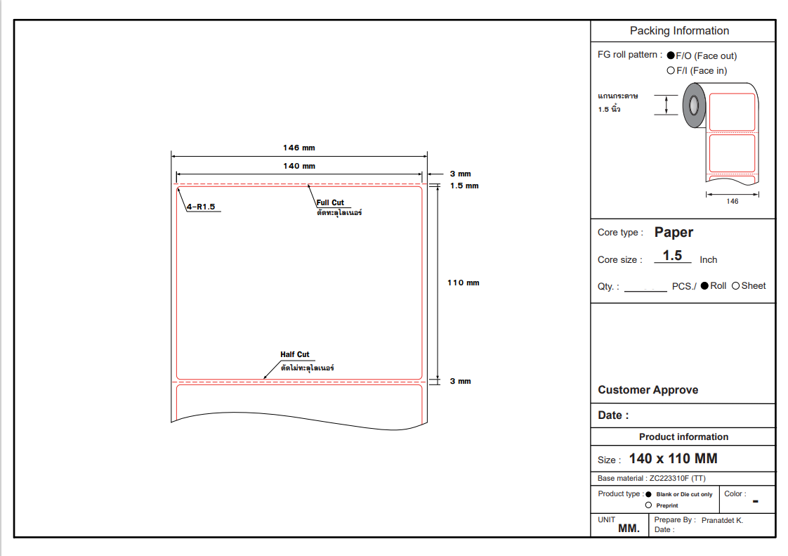 สติ๊กเกอร์ดวงเปล่า แบบกึ่งมันกึ่งด้าน Thermal Transfer (TT) ขนาด 140 x 110 มิลลิเมตร (14 x 11 cm) แกน 1.5 นิ้ว ใช้กับหมึกริบบอน เหมาะสำหรับ ฉลากบาร์โค้ดขนาดเล็ก ฉลากราคา ฉลากข้อมูลสินค้า ฉลากวันหมดอายุ เป็นต้น ถ้าลูกค้าต้องการขนาดอื่น สามารถสั่งผลิตตามขนาดที่ลูกค้าต้องการได้