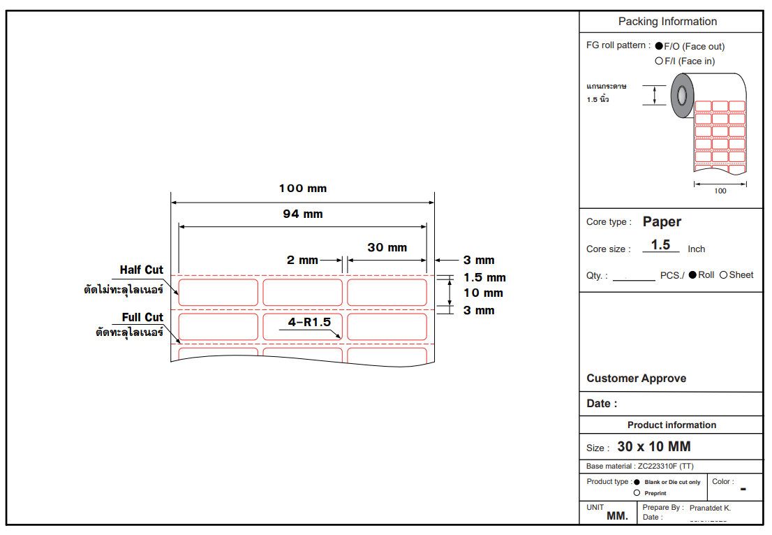 สติ๊กเกอร์ดวงเปล่า แบบกึ่งมันกึ่งด้าน Thermal Transfer (TT) ขนาด 30 x 10 มิลลิเมตร (3 x 1 เซนติเมตร) แกน 1.5 นิ้ว ใช้กับหมึกริบบอน เหมาะสำหรับ สติ๊กเกอร์จ่าหน้าซอง ฉลากสินค้าต่างๆ เป็นต้น ถ้าลูกค้าต้องการขนาดอื่น สามารถสั่งผลิตตามขนาดที่ลูกค้าต้องการได้