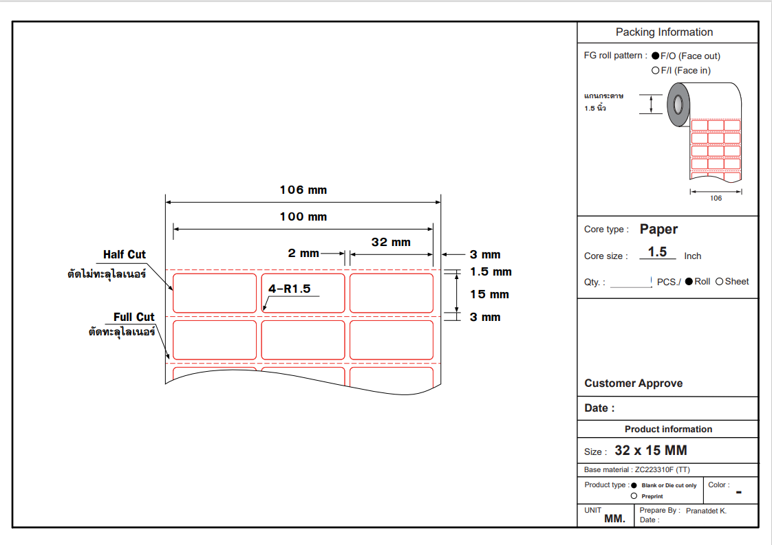 สติ๊กเกอร์ดวงเปล่า แบบกึ่งมันกึ่งด้าน Thermal Transfer (TT) ขนาด 32 x 15 มิลลิเมตร (3.2 x 1.5 cm) แกน 1.5 นิ้ว ใช้กับหมึกริบบอน เหมาะสำหรับ สติ๊กเกอร์จ่าหน้าซอง ฉลากสินค้าต่างๆ เป็นต้น ถ้าลูกค้าต้องการขนาดอื่น สามารถสั่งผลิตตามขนาดที่ลูกค้าต้องการได้