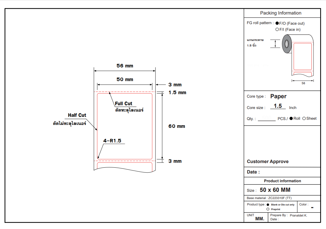 สติ๊กเกอร์ดวงเปล่า แบบกึ่งมันกึ่งด้าน Thermal Transfer (TT) ขนาด 50 x 60 มิลลิเมตร (5 x 6 ซม.) แกน 1.5 นิ้ว ใช้กับหมึกริบบอน เหมาะสำหรับ สติ๊กเกอร์จ่าหน้าซอง ฉลากสินค้าต่างๆ งานขนส่ง เป็นต้น ถ้าลูกค้าต้องการขนาดอื่น สามารถสั่งผลิตตามขนาดที่ลูกค้าต้องการได้ เหมาะสำหรับ งานพิมพ์ทั่วไปเนื่องจากราคาประหยัด ไม่ต้องการความทนทานของตัวหนังสือ แต่ไม่เหมาะสำหรับการใช้งานพิมพ์ฉลากที่ติดสินค้าแล้วมีการเสียดสีกัน