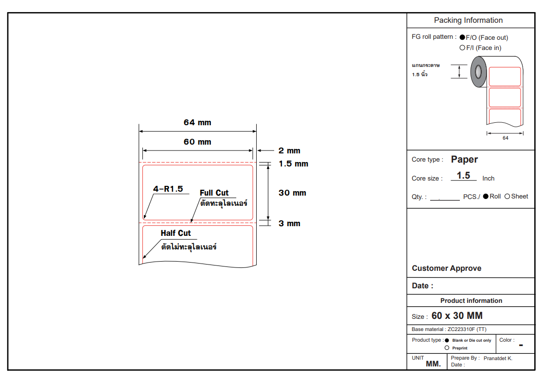 สติ๊กเกอร์ดวงเปล่า แบบกึ่งมันกึ่งด้าน Thermal Transfer (TT) ขนาด 75 x 45 มิลลิเมตร (7.5 x 4.5 cm) แกน 1.5 นิ้ว ใช้กับหมึกริบบอน เหมาะสำหรับ ฉลากบาร์โค้ดขนาดเล็ก ฉลากราคา ฉลากข้อมูลสินค้า ฉลากวันหมดอายุ เป็นต้น ถ้าลูกค้าต้องการขนาดอื่น สามารถสั่งผลิตตามขนาดที่ลูกค้าต้องการได้