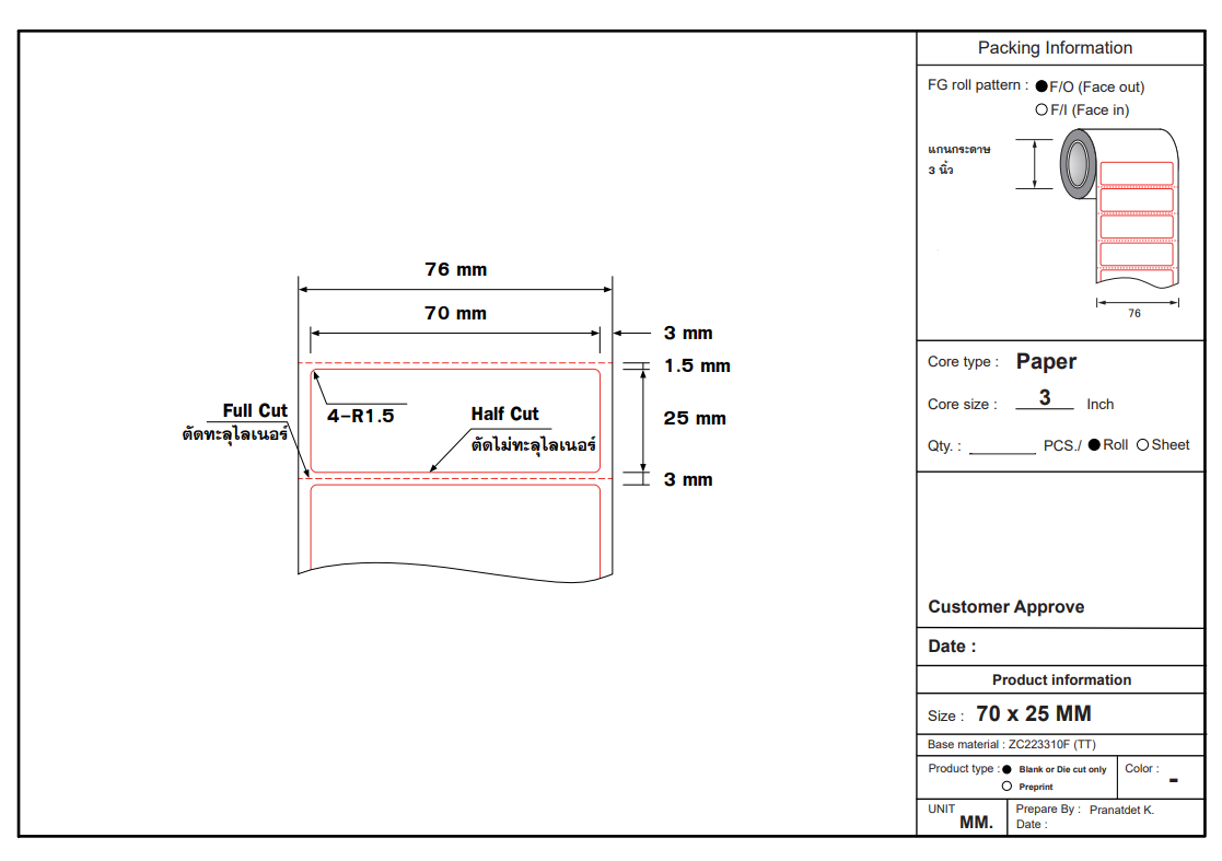 ST.TT Size 70 x 25 mm (7 x 2.5 cm) Sticker แกน 3 นิ้ว สติ๊กเกอร์กระดาษ กึ่งมันกึ่งด้าน (ใช้ร่วมกับ Wax Ribbon หรือ Wax Resin Ribbon)