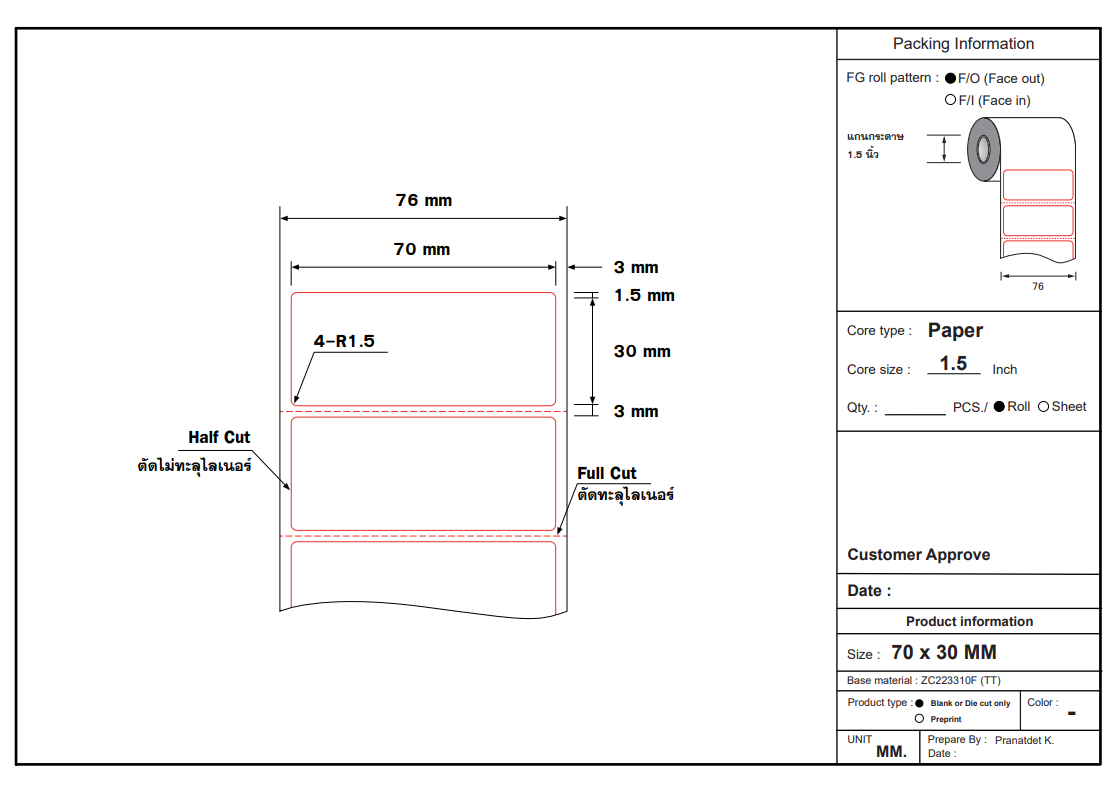 สติ๊กเกอร์ดวงเปล่า แบบกึ่งมันกึ่งด้าน Thermal Transfer (TT) ขนาด 70 x 30 มิลลิเมตร แกน 1.5 นิ้ว ใช้กับหมึกริบบอน เหมาะสำหรับ สติ๊กเกอร์จ่าหน้าซอง ฉลากสินค้าต่างๆ เป็นต้น ถ้าลูกค้าต้องการขนาดอื่น สามารถสั่งผลิตตามขนาดที่ลูกค้าต้องการได้