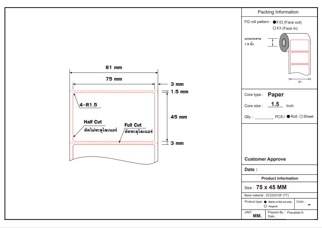 สติ๊กเกอร์ดวงเปล่า แบบกึ่งมันกึ่งด้าน Thermal Transfer (TT) ขนาด 75 x 45 มิลลิเมตร (7.5 x 4.5 cm) แกน 1.5 นิ้ว ใช้กับหมึกริบบอน เหมาะสำหรับ ฉลากบาร์โค้ดขนาดเล็ก ฉลากราคา ฉลากข้อมูลสินค้า ฉลากวันหมดอายุ เป็นต้น ถ้าลูกค้าต้องการขนาดอื่น สามารถสั่งผลิตตามขนาดที่ลูกค้าต้องการได้
