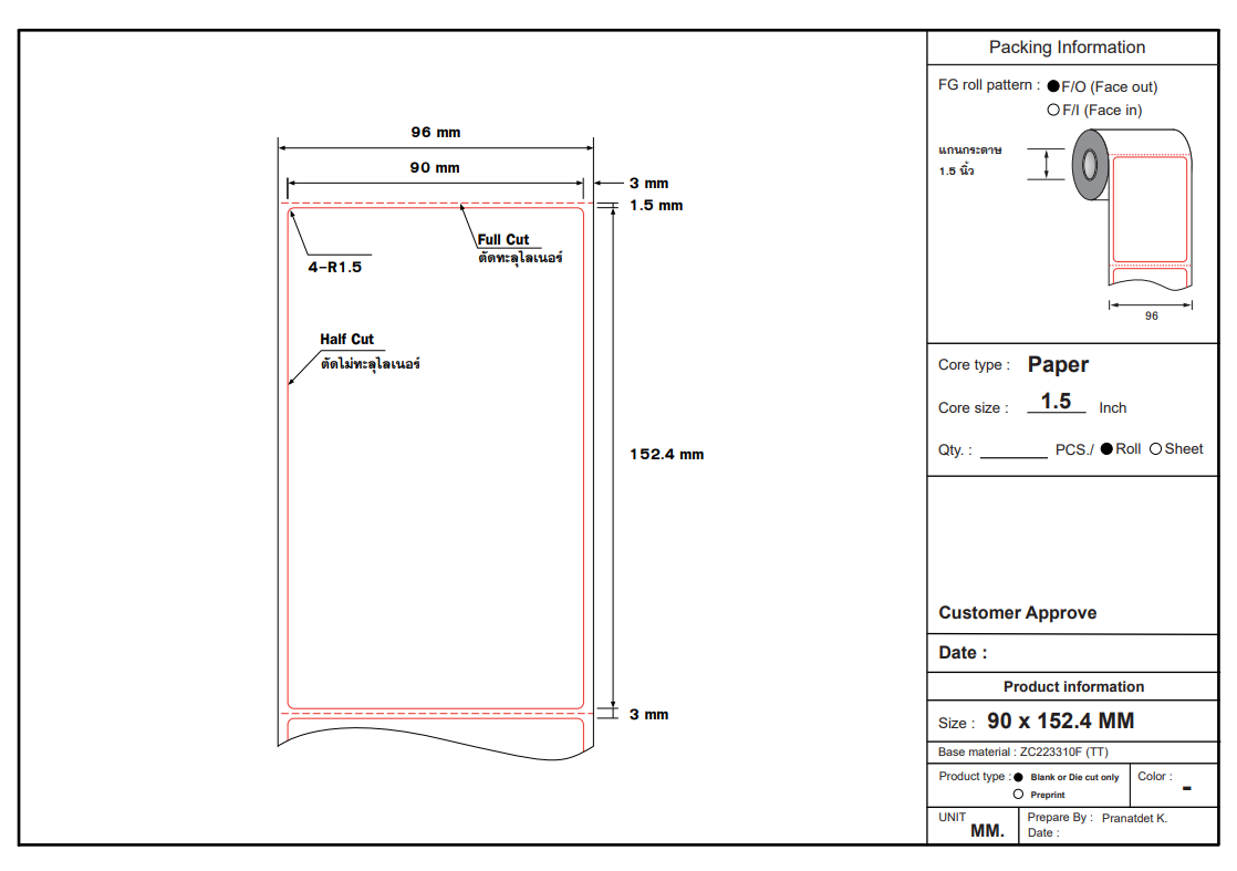 สติ๊กเกอร์ดวงเปล่า แบบกึ่งมันกึ่งด้าน Thermal Transfer (TT) ขนาด 90 x 152.4 มิลลิเมตร (9 x 15.24 cm) แกน 1.5 นิ้ว ใช้กับหมึกริบบอน เหมาะสำหรับ ฉลากบาร์โค้ดขนาดเล็ก ฉลากราคา ฉลากข้อมูลสินค้า ฉลากวันหมดอายุ เป็นต้น ถ้าลูกค้าต้องการขนาดอื่น สามารถสั่งผลิตตามขนาดที่ลูกค้าต้องการได้