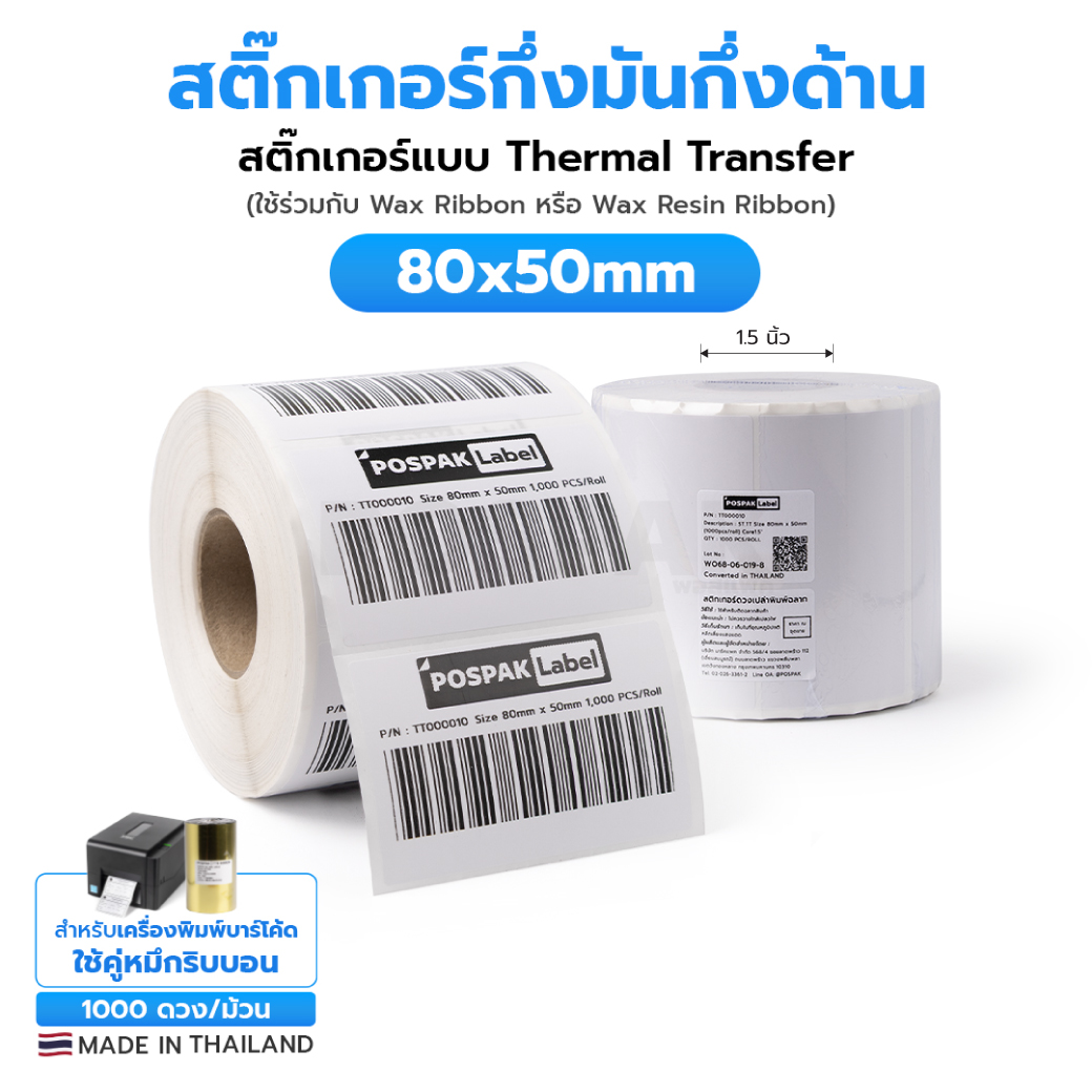 สติ๊กเกอร์ดวงเปล่า แบบกึ่งมันกึ่งด้าน Thermal Transfer (TT) ขนาด 80 x 50 มิลลิเมตร แกน 1.5 นิ้ว ใช้กับหมึกริบบอน เหมาะสำหรับ สติ๊กเกอร์ สคบ., สติ๊กเกอร์บาร์โค้ดติดสินค้า, สติ๊กเกอร์ราคาติดสินค้า เป็นต้น ถ้าลูกค้าต้องการขนาดอื่น สามารถสั่งผลิตตามขนาดที่ลูกค้าต้องการได้