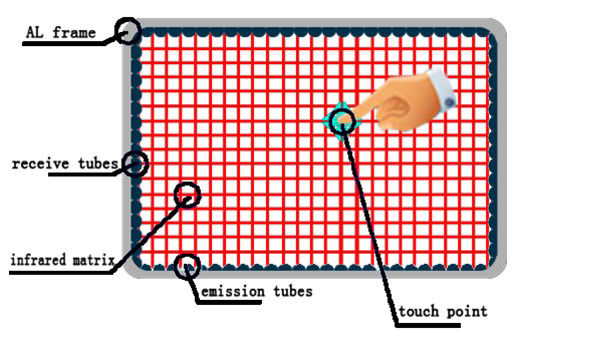เทคโนโลยี IR touch เกี่ยวข้องกับการซ้อนทับแบบฝังตัวของคานอินฟราเรดจากบนลงล่างและด้านข้างไปมารอบ ๆ ฝาปิดของอุปกรณ์ เมื่อเครื่องบินที่มองไม่เห็นจากคานที่หักด้วยวัตถุใด ๆ อุปกรณ์จะลงทะเบียนจุดสัมผัส ด้วยจุดสัมผัสที่ใช้งานได้ถึง 40 จุด จอแสดงผลแบบสัมผัสของ IR มีความแม่นยำน้อยกว่าการแสดง PCAP กล่าวได้ว่าจอภาพอินฟราเรดยังคงมีความถูกต้องเพียงพอที่จะใช้ในการตั้งค่าต่างๆได้หลากหลาย แต่เมื่อใช้กลางแจ้งในวันที่มีแสงจ้าแดดแสงแดดอาจรบกวนการรับสัมผัสของทับซ้อนกัน