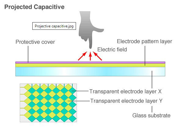 โครงสร้างภายในของแผงสัมผัสเหล่านี้ประกอบด้วยพื้นผิวผสมผสานชิพ IC เพื่อประมวลผลการคำนวณซึ่งเป็นชั้นของอิเล็กโทรดที่มีความโปร่งใสจำนวนมากอยู่ในรูปแบบเฉพาะ พื้นผิวถูกปกคลุมด้วยกระจกฉนวนหรือฝาครอบพลาสติก เมื่อนิ้วเข้าใกล้พื้นผิวความจุไฟฟ้าสถิตระหว่างขั้วไฟฟ้าหลายตัวจะเปลี่ยนไปพร้อม ๆ กันและตำแหน่งที่เกิดการติดต่อสามารถระบุได้อย่างแม่นยำโดยการวัดอัตราส่วนระหว่างกระแสไฟฟ้าเหล่านี้